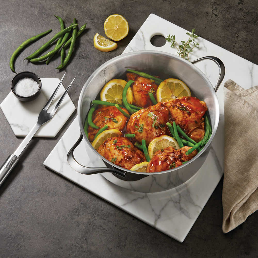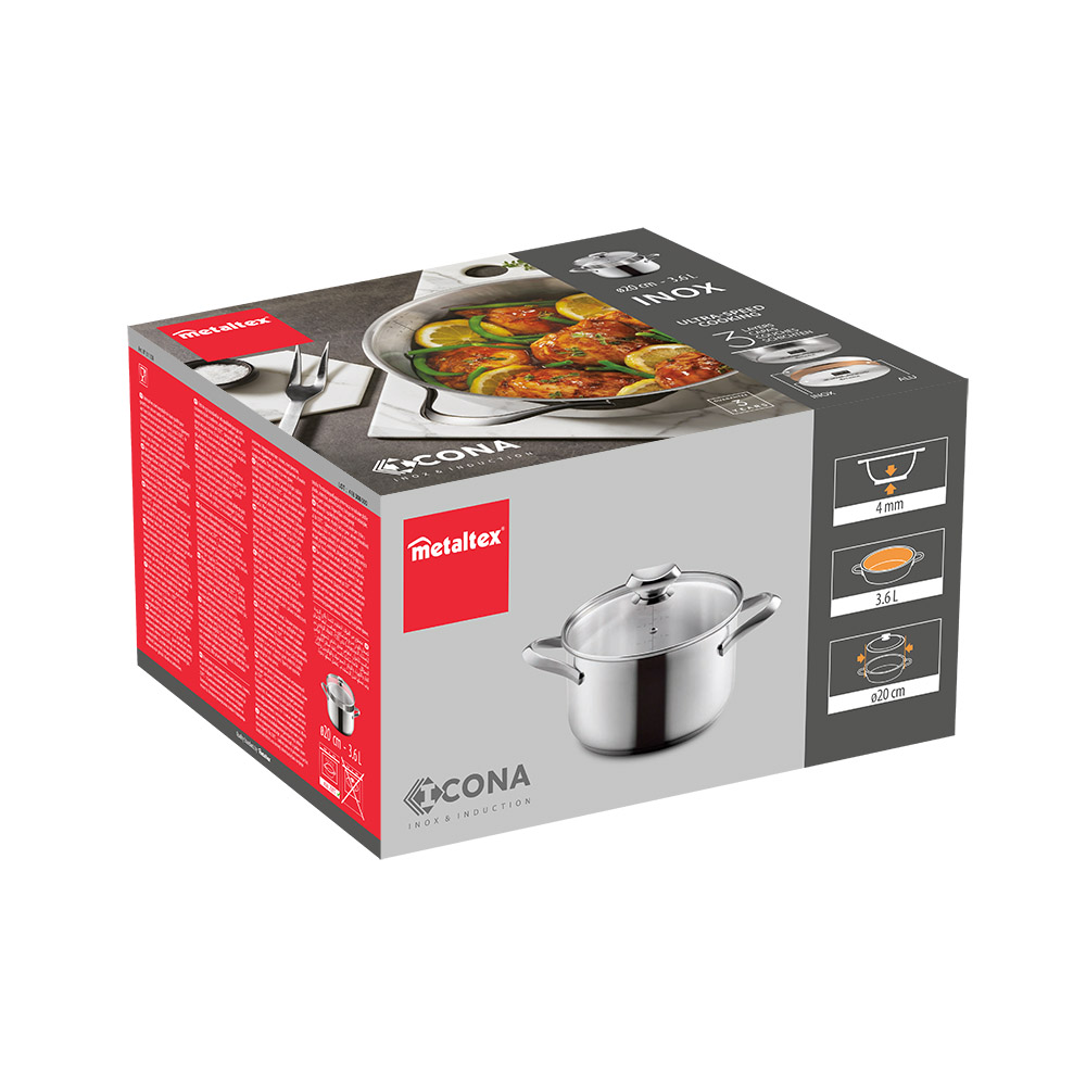 Capacidad: 3,6 L Fondo de 3 capas (acero inox/aluminio/acero inox) ultra-speed full induction de 4 mm de espesor adecuada para todo tipo de cocinas Tapadera de vidrio templado con orificio para salida de vapor y con aro y pomo de acero inoxidable Cuerpo con escala graduada interna para facilitar la medición de líquidos Packaging: caja