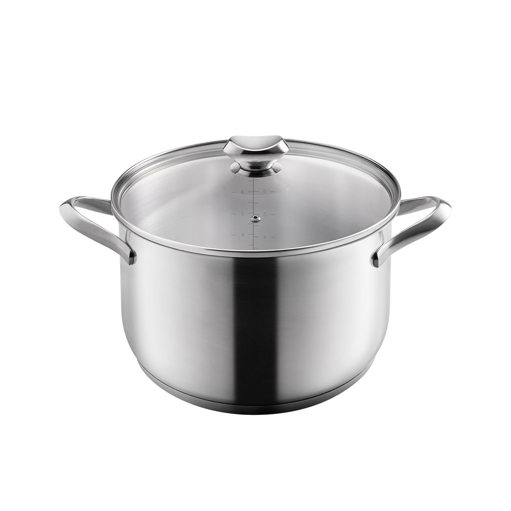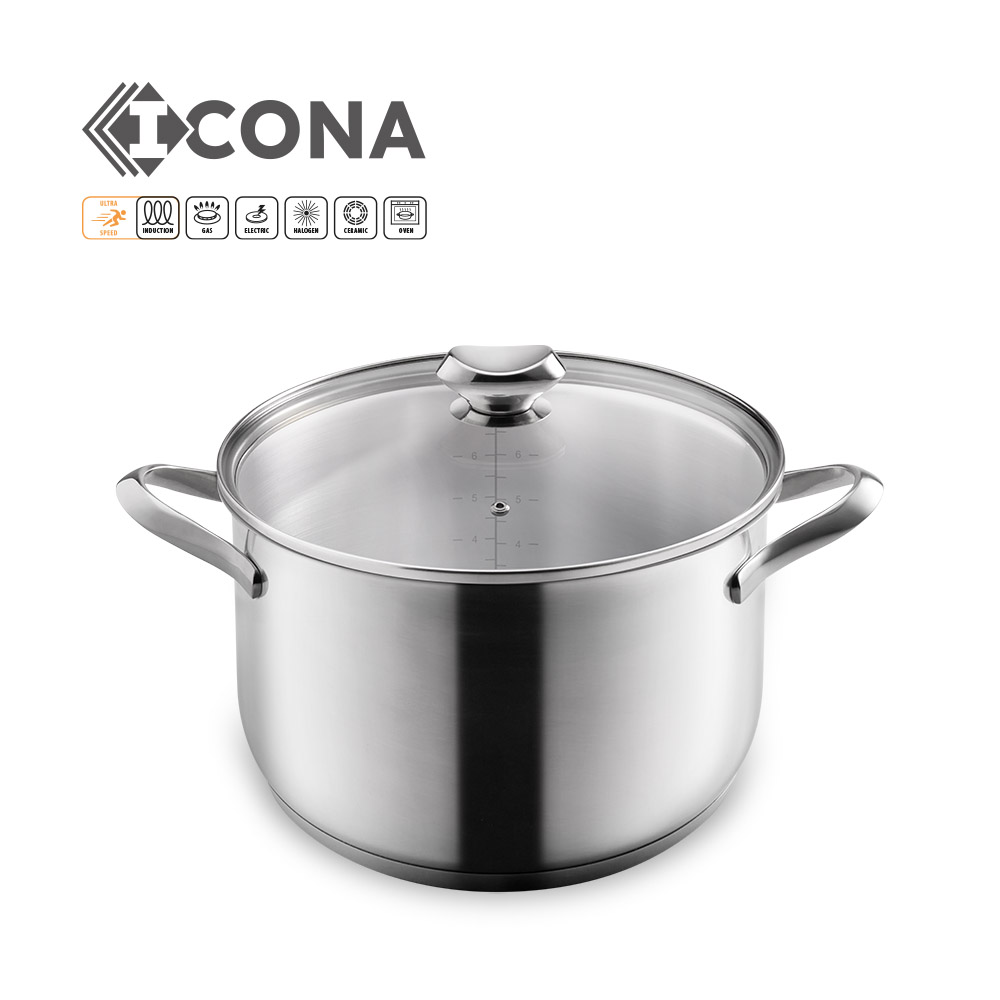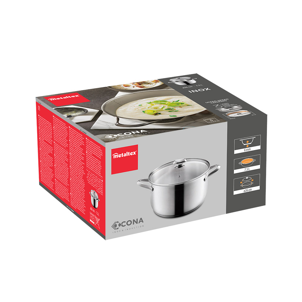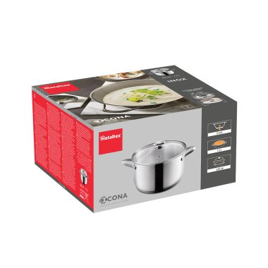 Capacidad: 7,5 L Fondo de 3 capas (acero inox/aluminio/acero inox) ultra-speed full induction de 6 mm de espesor adecuada para todo tipo de cocinas Tapadera de vidrio templado con orificio para salida de vapor y con aro y pomo de acero inoxidable Cuerpo con escala graduada interna para facilitar la medición de líquidos Packaging: caja